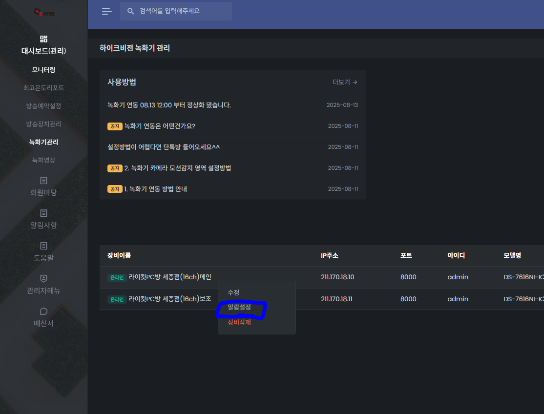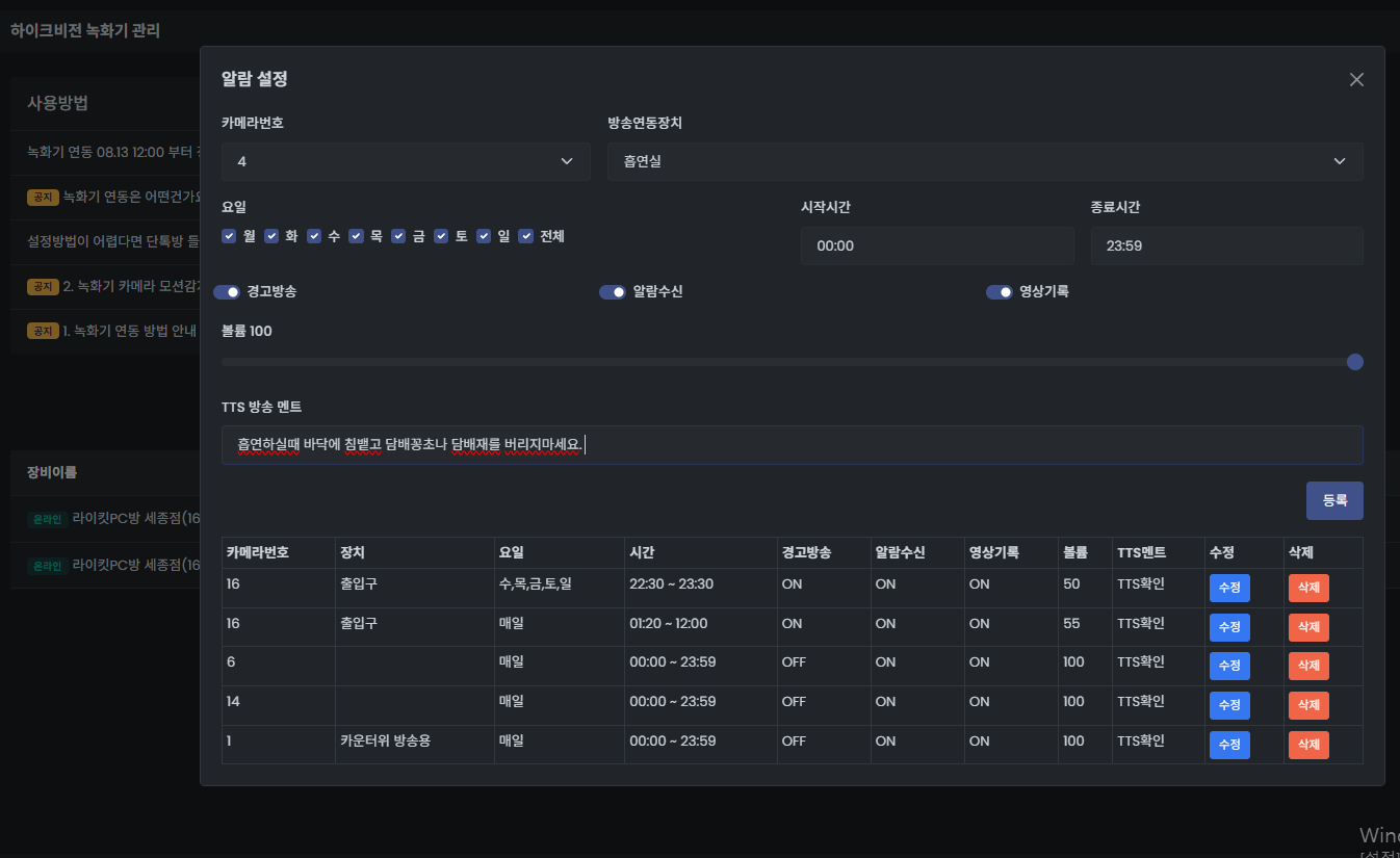 위 게시글 까지 하셨다면, 알람등록을 설정하시면 녹화영상 및 연동된 방송장치에 TTS 방송이 실행됩니다.